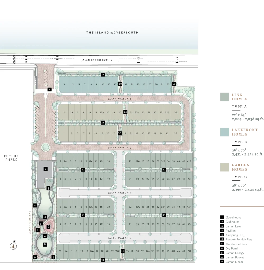 Avalon @ Cybersouth is the township’s final landed residential phase, featuring modern double-storey homes surrounded by lush greenery, central park facilities, and lakefront views. Spanning 25 acres with 343 units, Avalon offers spacious layouts from 2,004–2,454 sq ft, designed for families and multi-generational living. With direct access to Cyberjaya, Putrajaya, and Dengkil, this exclusive enclave combines comfort, privacy, and sustainable township living in one of Klang Valley’s fastest-growing addresses